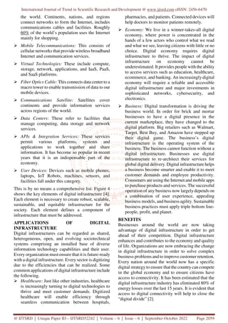 The paper discusses the vital importance of digital infrastructure in supporting the global economy, particularly emphasizing its role during the COVID-19 pandemic which highlighted the necessity for connectivity. It defines digital infrastructure as the combination of physical and virtual technologies enabling operations across various sectors, and notes its applications in healthcare, business, and the economy. The authors conclude that investment in digital infrastructure is essential for enhancing competition, addressing digital divides, and fostering sustainable development.