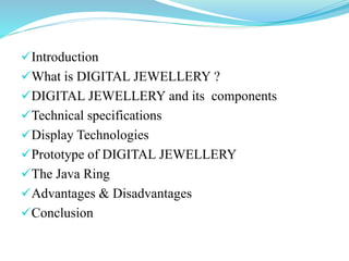 Digital jewelry is emerging as a new technology that embeds computing capabilities into jewelry and accessories. Prototypes include a ring that flashes different colors to identify incoming calls, earrings with speakers, and a bracelet with a small display. The components of a digital jewelry device would include a screen or display, microphone, antenna, and battery. Technical challenges remain around charging and costs, but digital jewelry may soon replace standalone devices by integrating computing into fashion items that are worn.