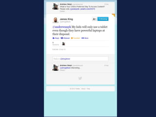 The document discusses research presented at the PSEWeb conference in 2013 on how children's interactions with technology are shaped by branding, privacy, and technology bias. It highlights significant differences in experiences based on age and explores how children understand and engage with technology through methods such as A/B testing. Key insights include children's preference for ebooks over print, their seamless movement between digital and analog tools, and concerns about privacy within peer groups.