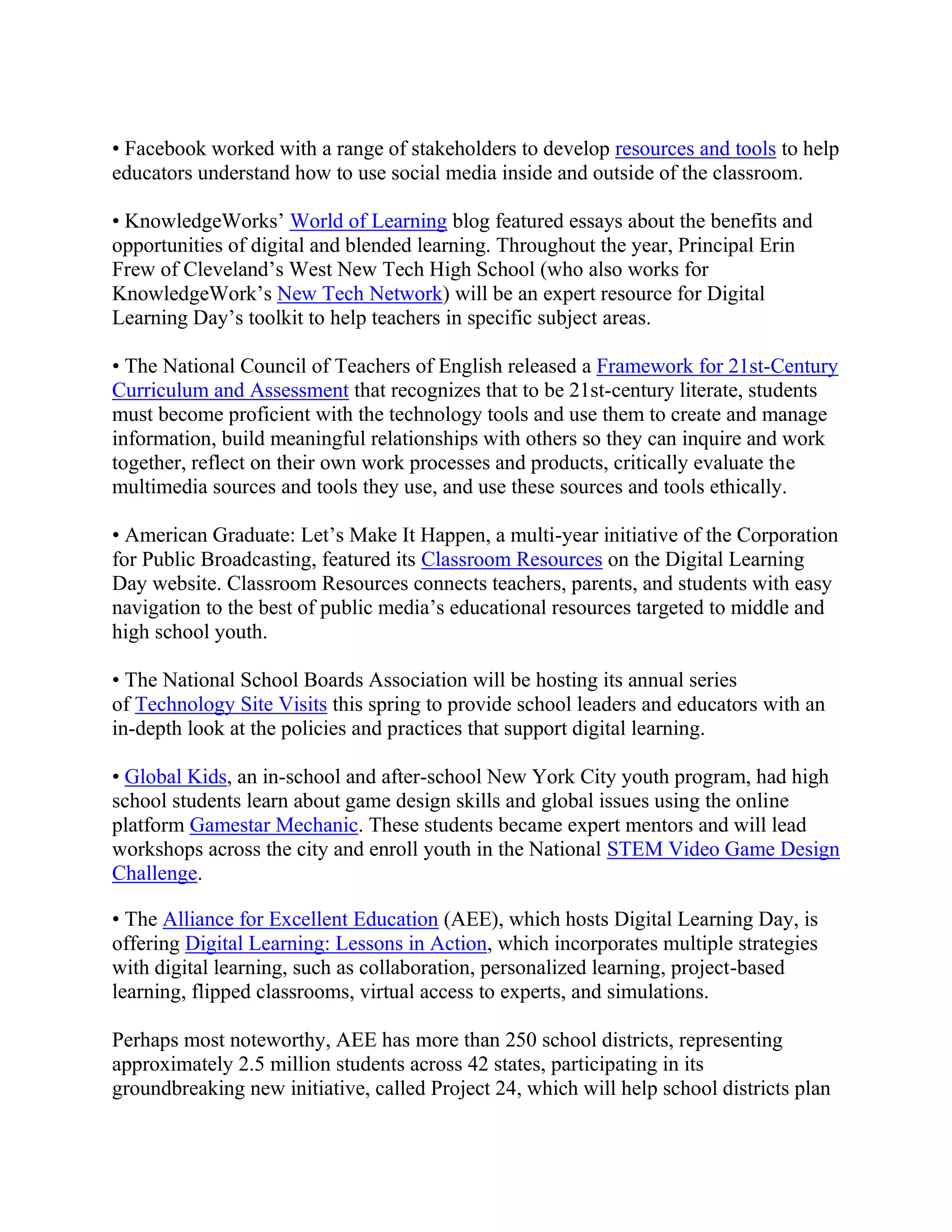 Digital Learning Day aims to promote digital learning in education. Over 25,000 educators participated in events on February 6th to mark the launch of a national digital learning campaign. The campaign includes Project 24, which provides school districts with customized digital learning plans, a Massive Open Online Course to educate teachers about educational technology, and encouraging the sharing of digital learning activities throughout February using #DLDay on social media. The overall goal is to help schools better integrate technology and digital resources into instruction to improve student learning.