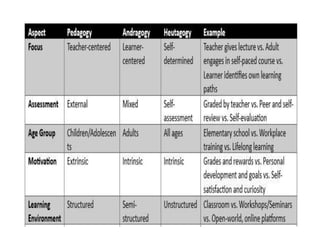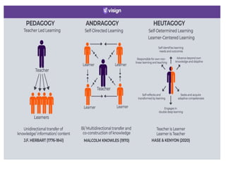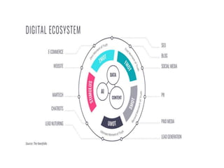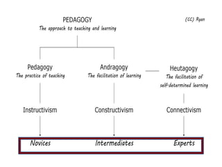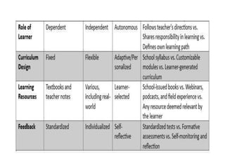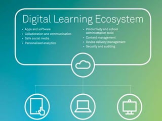 The document discusses the evolution and impact of digital learning ecosystems in education, emphasizing the importance of pedagogy over technology. It highlights the necessity for educators to adapt to changing educational paradigms and leverage technology to enhance teaching and learning experiences. Additionally, it outlines various teaching methodologies, learner engagement strategies, and the role of educational technology in modern classrooms.