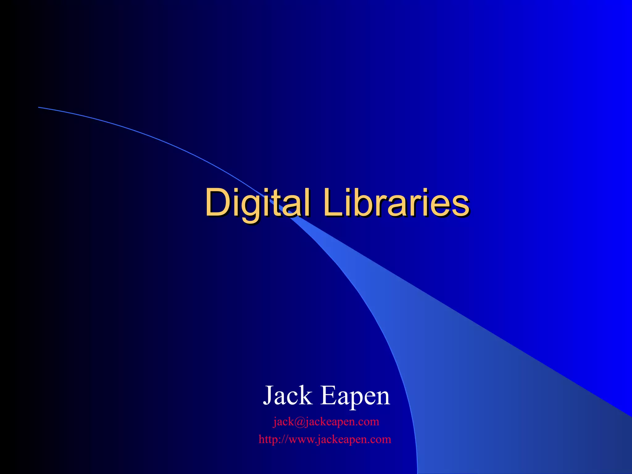 This document provides an overview of digital libraries, including definitions, benefits, limitations, components, standards, and challenges. It defines a digital library as a collection of information stored and accessed electronically, extending the functions of a traditional library digitally. Benefits include improved access and searchability, easier information sharing and preservation. Emerging technologies discussed include metadata standards, XML, and protocols like OAI-PMH for metadata harvesting. Common digital library software includes DSpace, Greenstone, and EPrints. Challenges involve digitization, description, legal issues, presentation of heterogeneous resources, and economic sustainability.