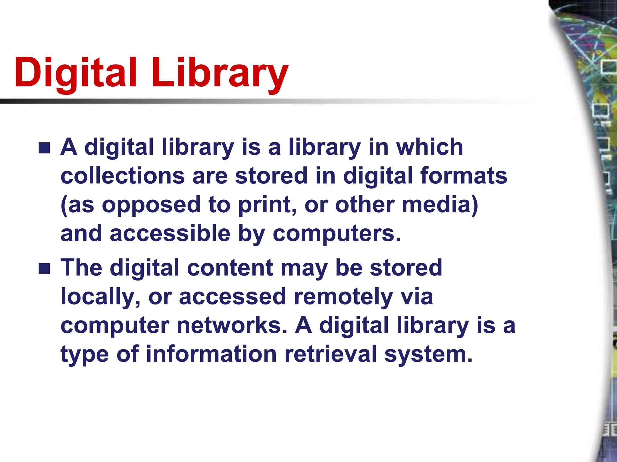A digital library stores collections of information in digital formats that are accessible via computer networks. It provides an architecture to organize, integrate and transform scattered digital documents. Companies can use a digital library as the foundation for decision support systems to perform more accurate analyses. There are different types of digital libraries including document libraries containing books and reports, and data warehouses which combine and store vast amounts of historical reference data from multiple sources. While digital libraries provide benefits like unlimited access and storage, they also involve significant costs for conversion, maintenance and technical support.