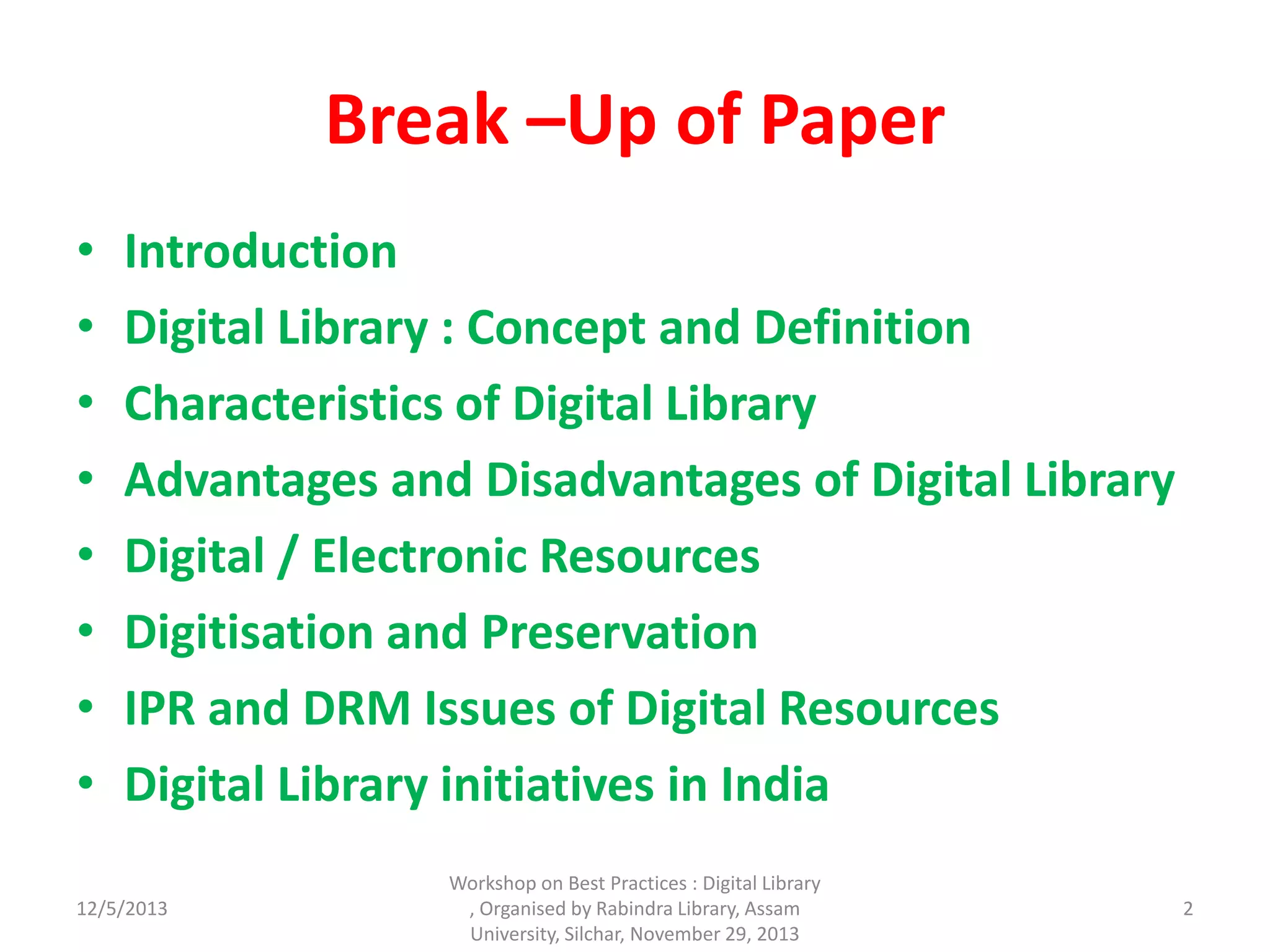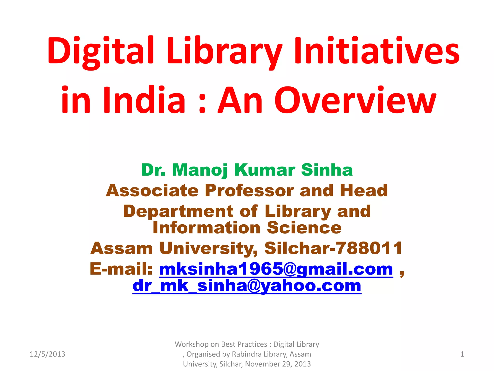 The document provides an overview of digital library initiatives in India, discussing their definition, characteristics, advantages, and the essential components for establishing these libraries. It highlights several key projects such as the Digital Library of India and the Traditional Knowledge Digital Library, as well as the government's efforts to collaborate internationally on digitization efforts. The document emphasizes the importance of digital libraries in enhancing access to information and preserving cultural heritage.