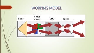 This document discusses digital light processing (DLP) technology. DLP uses thousands of tiny mirrors on a digital micromirror device (DMD) chip to reflect light and produce high-quality images. It provides advantages like brightness, sharpness, and versatility. The document outlines the history and components of DLP, how DLP works by converting signals and creating color and grayscale images, and applications like DLP televisions. Potential disadvantages include the "rainbow effect" seen by some users. The future of DLP is promising as the technology is used in more business and high-definition projection applications.