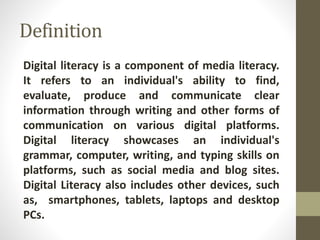 Digital literacy at the Mangrove Institute of Science and Technology encompasses the ability to effectively find, evaluate, produce, and communicate information across digital platforms. It includes essential skills such as searching for information, ensuring digital safety, and utilizing various digital devices. The document highlights practical tips for improving digital literacy and the importance of understanding information authenticity.