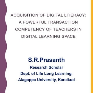 This document discusses the importance of digital literacy for teachers. It defines digital literacy as the ability to find, evaluate, utilize, share and create content using technology and the internet. It identifies several elements of digital literacy including computer literacy, network literacy, media literacy, and information literacy. The document outlines advantages of digital literacy for both teachers and students, such as increased engagement, collaboration, improved digital skills, and bringing the classroom into the 21st century. It discusses the role of educational institutions and agencies in providing pre-service and in-service training to develop teachers' digital competencies. Finally, it identifies several sources for teachers to develop their own digital literacy, such as reading articles, tutorials, workshops and attending seminars on educational
