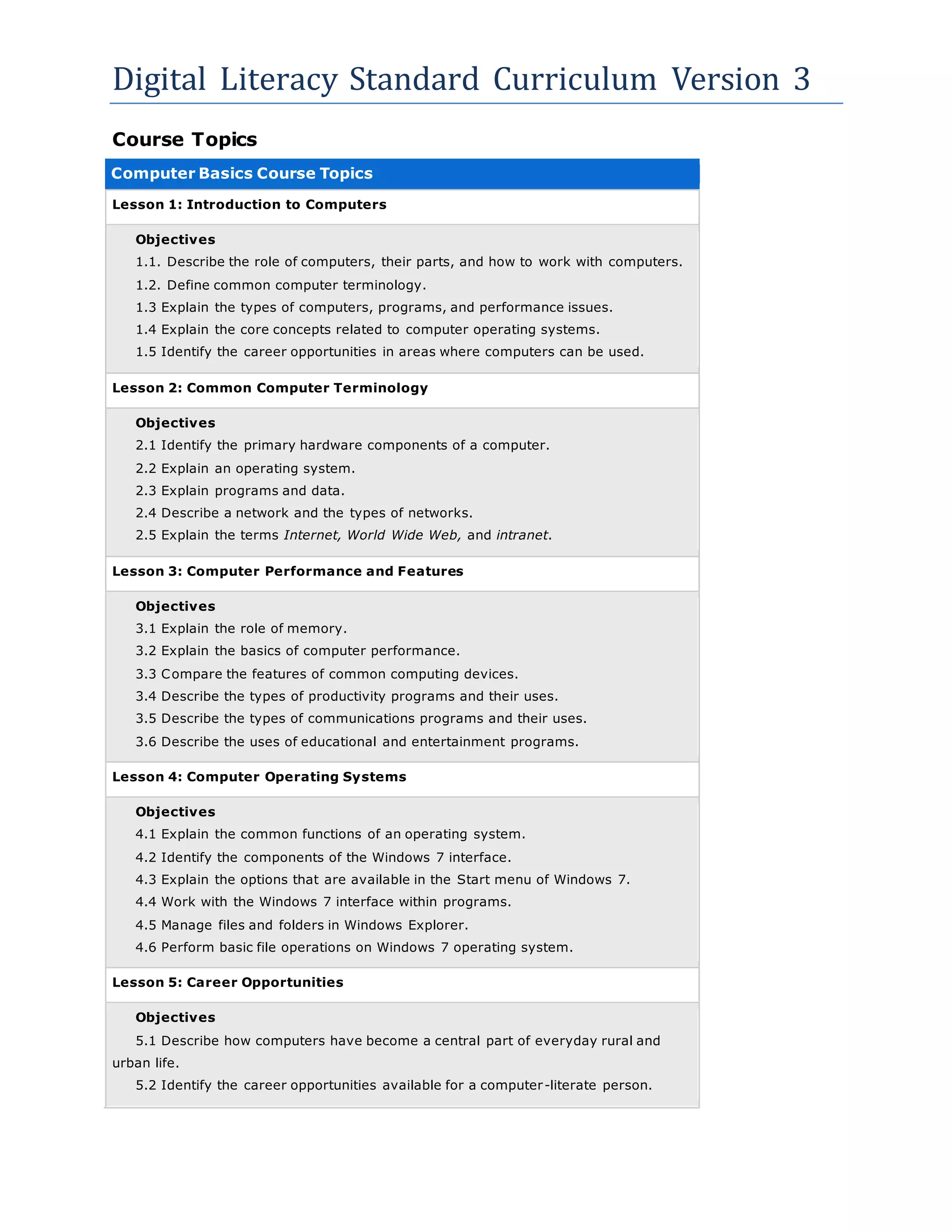 The document outlines the course topics and objectives for a Digital Literacy Standard Curriculum. It covers 6 courses: Computer Basics, The Internet and World Wide Web, Productivity Programs, Computer Security and Privacy, and Digital Lifestyles. Each course contains multiple lessons that teach basic computer and technology concepts, skills, and career opportunities related to digital literacy. The curriculum aims to provide students with a foundational understanding of computers, software, online safety, and using digital tools and media.