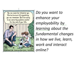 This document summarizes a workshop on digital literacies presented by Fiona Harvey and Lisa Harris. It discusses the changing nature of skills needed for careers and education in the digital age. These include effectively managing online information and identities, creating and sharing content, and networking and collaborating online. The workshop highlighted digital literacy initiatives at the University of Southampton including a student champion program, curriculum innovations, and research on social media use at live events. Plans for future activities focus on developing students' digital skills and recognizing these skills as graduate attributes.