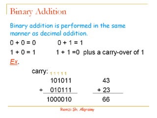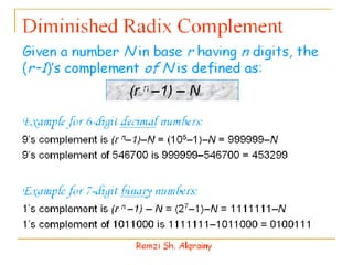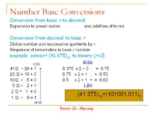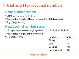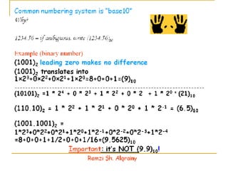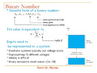 - Numbers in digital systems are represented using strings of digits in different bases, with each digit position having an associated weight. Common number bases include binary, octal, decimal, and hexadecimal.