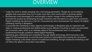The document highlights the critical importance of digital marketing for modern businesses, emphasizing that traditional marketing methods are inadequate in today's tech-driven landscape. It discusses how digital marketing, facilitated by platforms like Apponix Technologies, enables businesses to reach consumers effectively and cost-efficiently through various strategies such as SEO and social media marketing. Additionally, it suggests that business owners must acquire digital marketing skills to remain competitive and avoid potential losses.