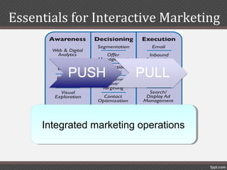 Interactive marketing utilizes integrated marketing operations and cross-channel marketing to reinforce brands and increase customer responses. Email marketing is a cost-effective tool to build customer relations, while personalization allows customizing experiences for individual customers using their data across online, mobile, and social channels. Social media and mobile media provide powerful tools for targeted communications through platforms like Facebook, Twitter, SMS, and mobile apps to reach customers wherever they are.