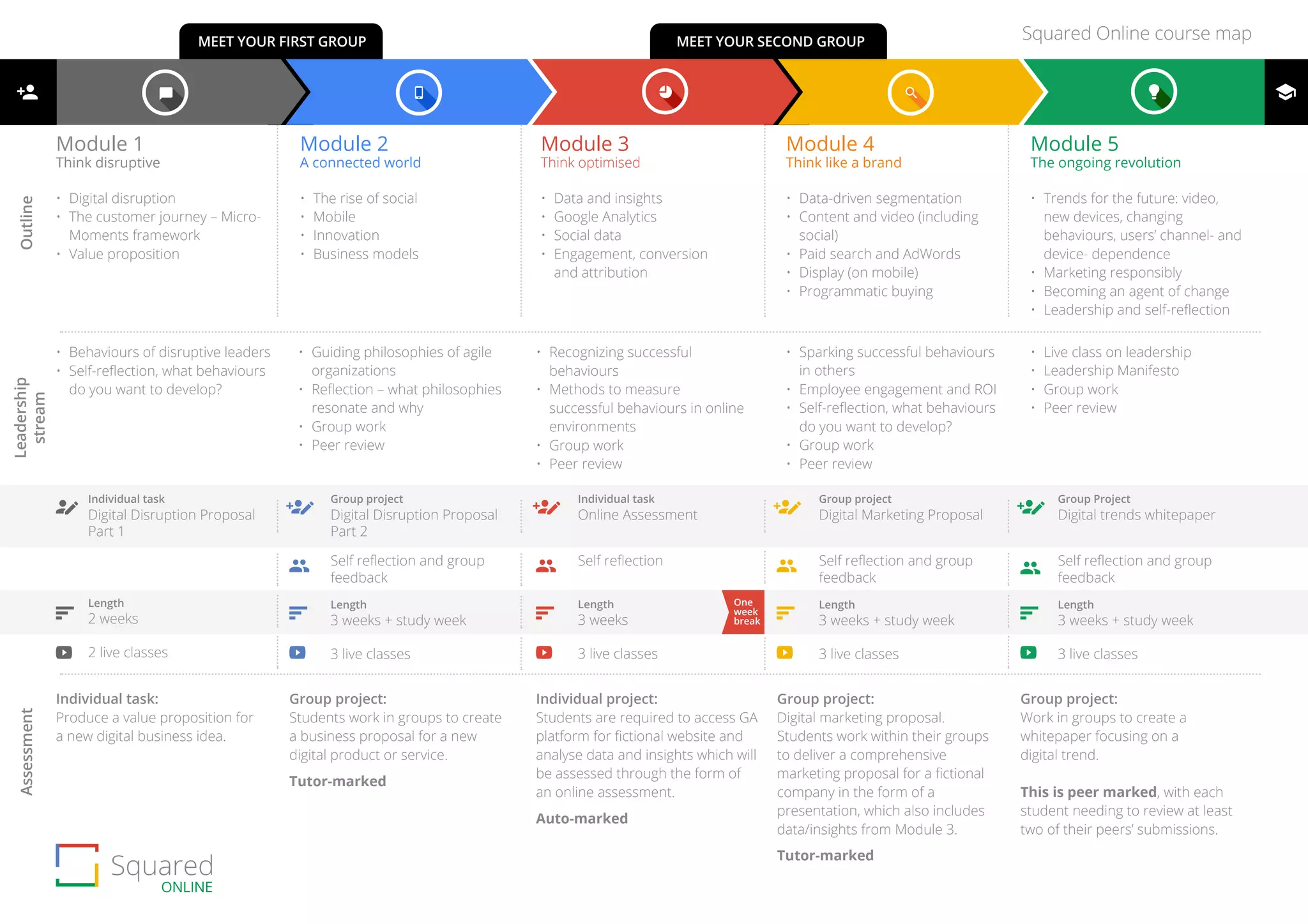 This document outlines the course structure and content for a Digital Disruption course delivered online. It includes 5 modules covering topics such as digital disruption, social media, data analytics, digital marketing, and future trends. Assessment consists of individual and group projects, online assessments, and self/peer reflections. Students work independently and in two separate groups on tasks such as a value proposition, data analysis, marketing proposals, and a trends whitepaper. The course aims to equip students with skills in digital strategy, marketing, and leadership.