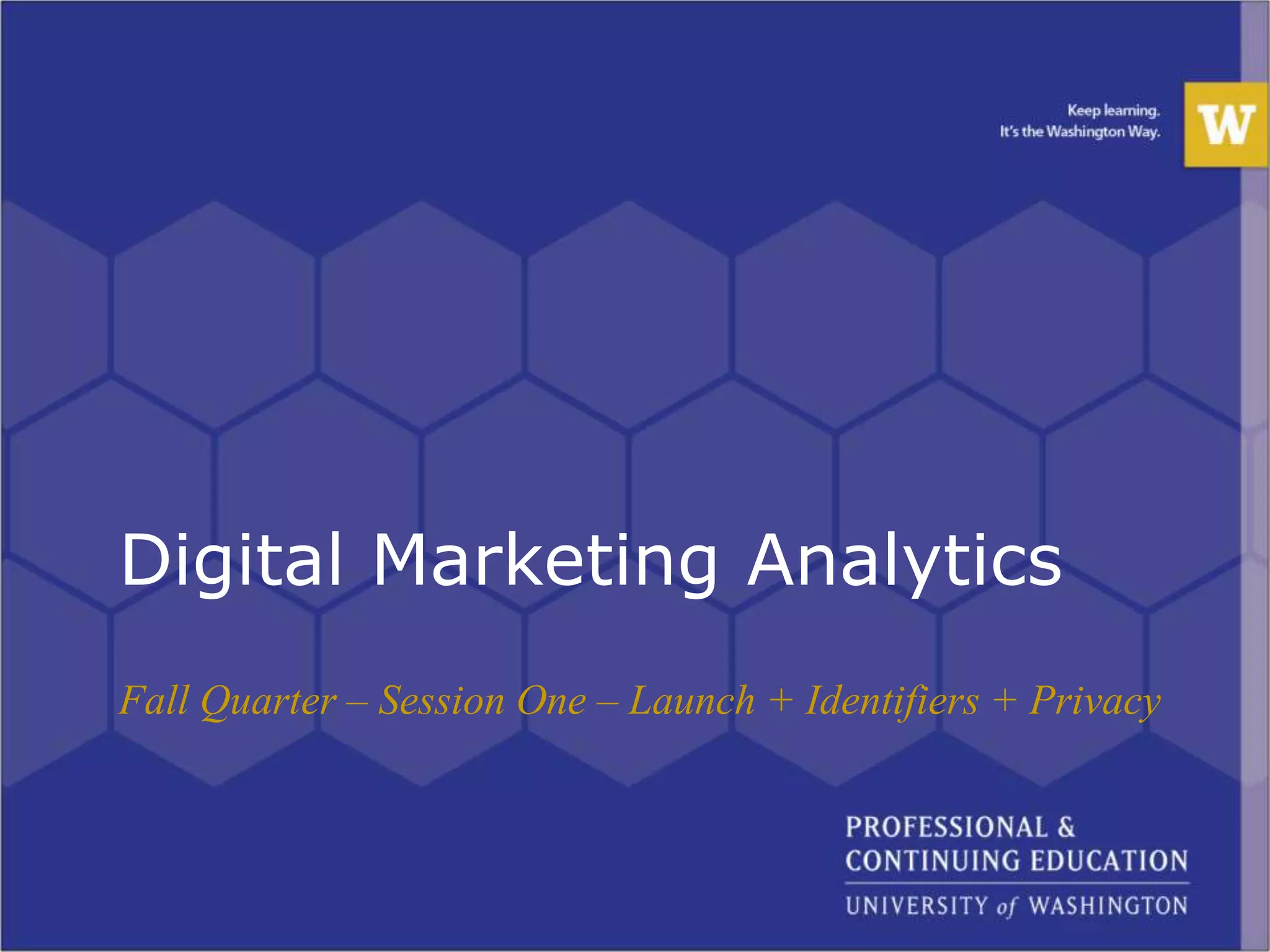 The document outlines a digital marketing analytics course that covers data types, privacy, and the functioning of digital systems. Its objectives include understanding major digital systems, connecting various data sources, and learning data manipulation methods to enhance digital marketing efforts. Participants are expected to engage actively, network, and leave the program with practical skills and knowledge to drive digital marketing initiatives forward.