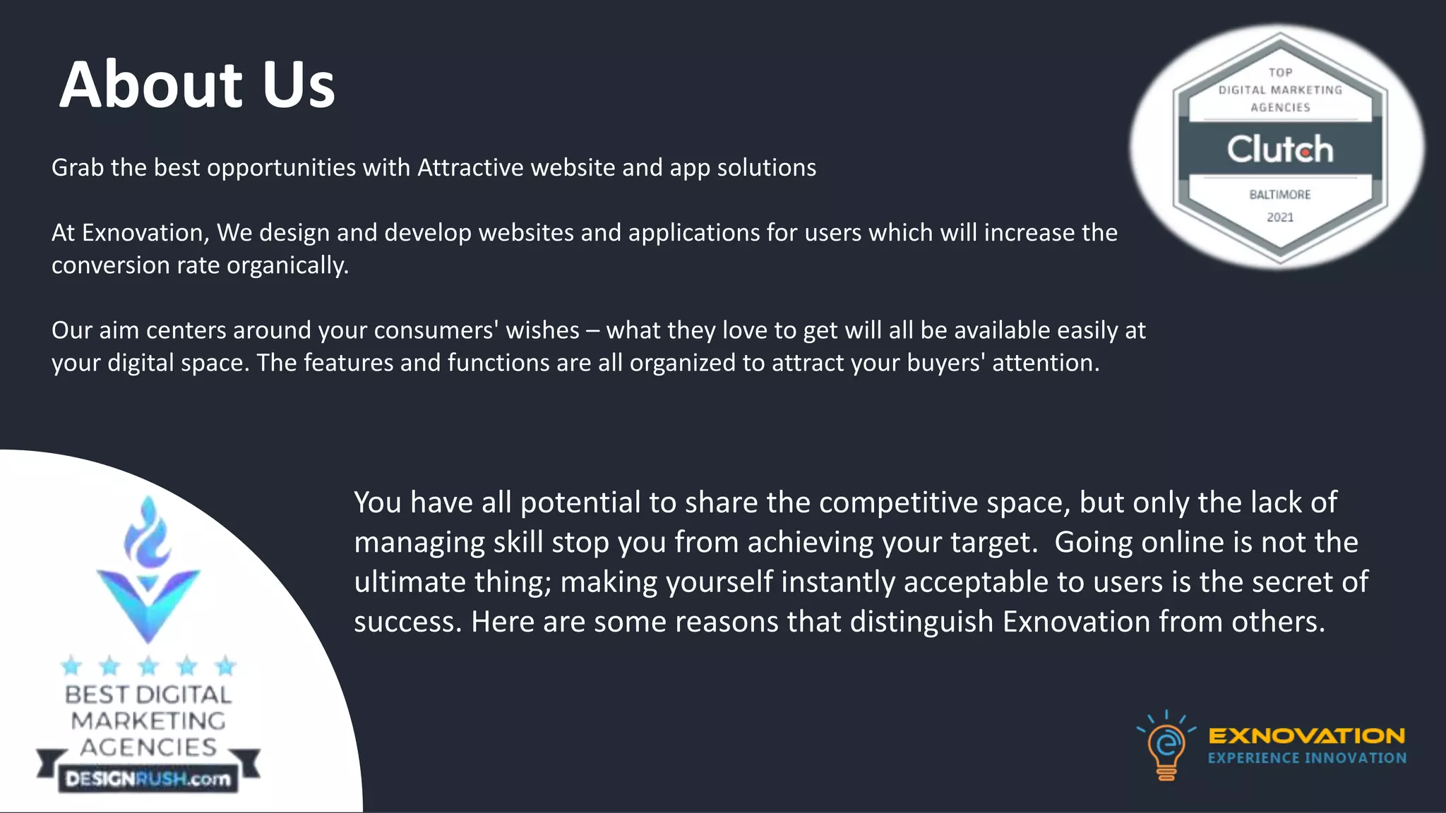 Exnovation offers website and application development services tailored to attract consumers and boost conversion rates through custom solutions. The company emphasizes affordability, speed, and customer satisfaction, providing various digital marketing and software services, including SEO, CRM, and mobile app development. Exnovation's team is dedicated to enhancing clients' digital presence while ensuring quality and effective management of resources.