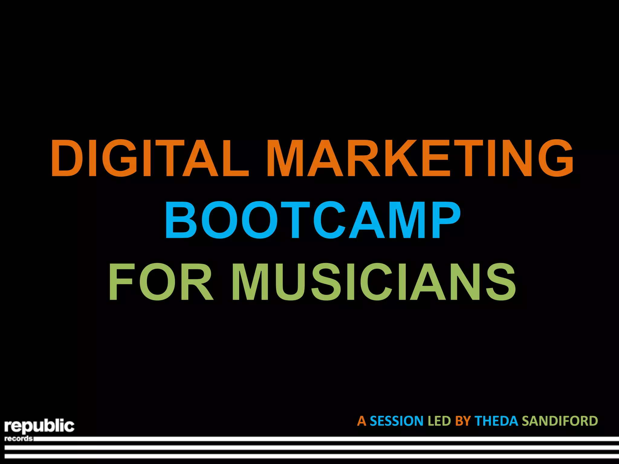 The document outlines strategies and case studies for improving digital marketing goals. It discusses improving social reach, fan engagement, identifying influencers, increasing lead generation, and applying analytics. Case studies include increasing Colbie Caillat's Facebook likes through contests and sharing fan content, Black Veil Brides promoting a new music video which reached a large audience, and analyzing the social media discussion around a feud between Angel Haze and Azealia Banks.