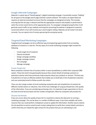 The document provides recommendations for implementing a digital marketing strategy consisting of website optimization, Google AdWords campaigns, and targeted email marketing campaigns. Some key recommendations include: 1) Optimizing websites for search engine optimization and usability, ensuring relevant and regularly updated content. 2) Using Google AdWords carefully to drive traffic but noting it requires expertise to avoid wasting money. 3) Creating targeted email lists and cleaning data to send personalized emails with clear calls to action and landing pages matching the email design.