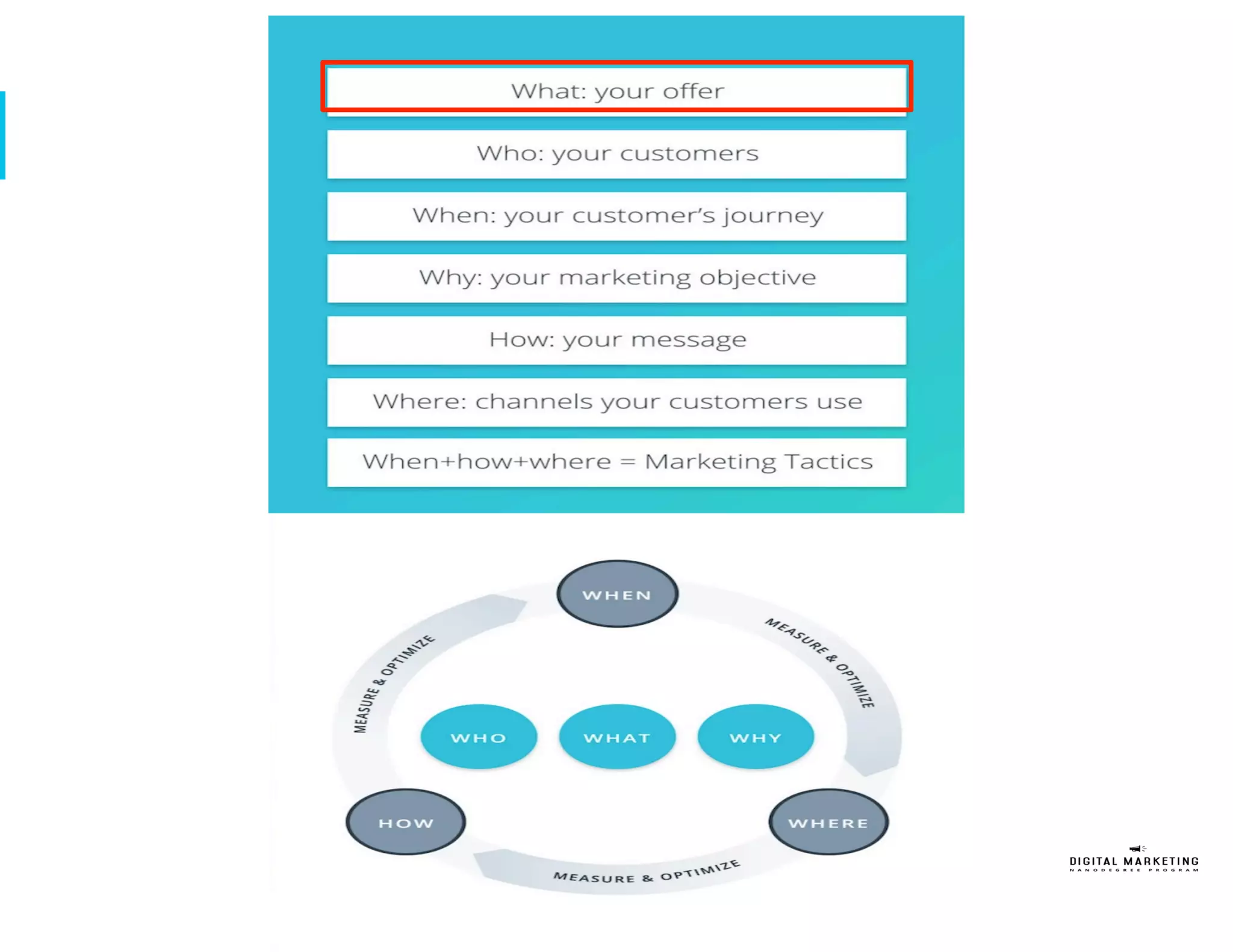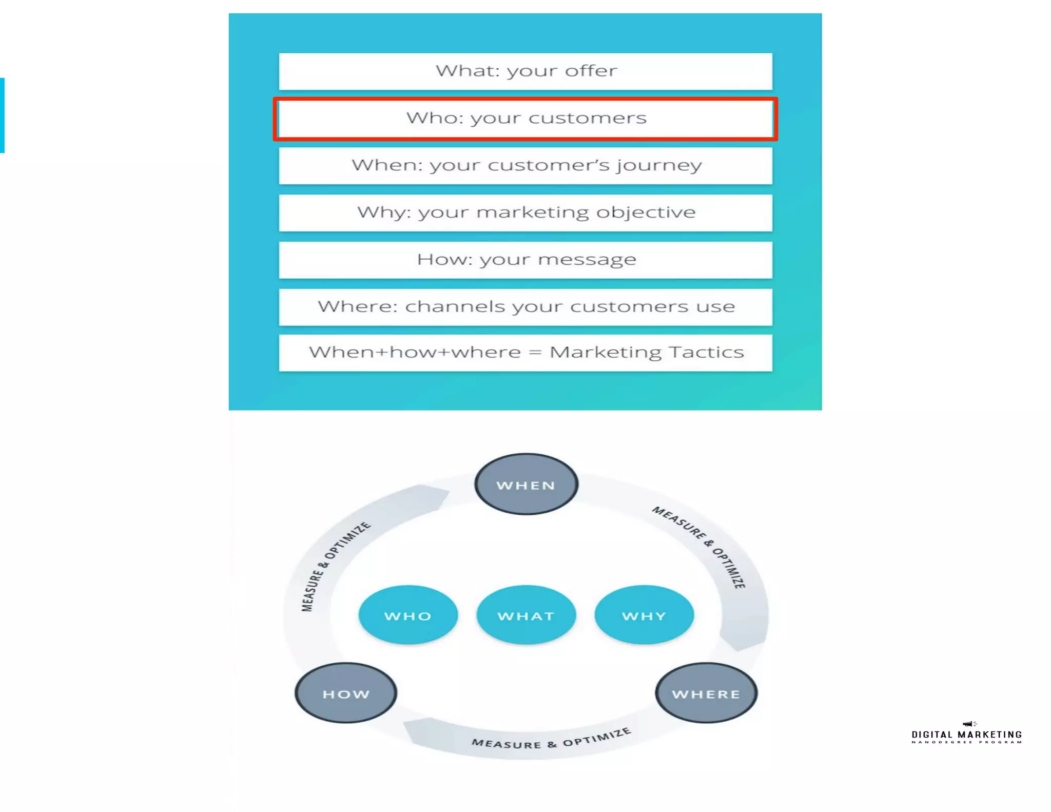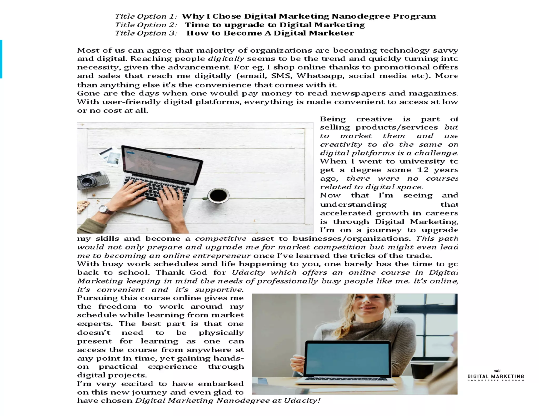 The document outlines a customer journey based marketing plan to sign up 200 new students for Udacity's Digital Marketing Nanodegree (DMND) program over one quarter with a $50,000 budget. It identifies the target persona as a 32-year old female professional seeking to upgrade her digital marketing skills. The plan details tactics for the awareness, interest, and desire phases of the customer journey across social media, search, display, and video channels. It allocates most of the budget to the desire phase and recommends additional tactics like search engine optimization and targeting LinkedIn. Key performance indicators include number of site visits, conversions, and achieving a positive return on investment.