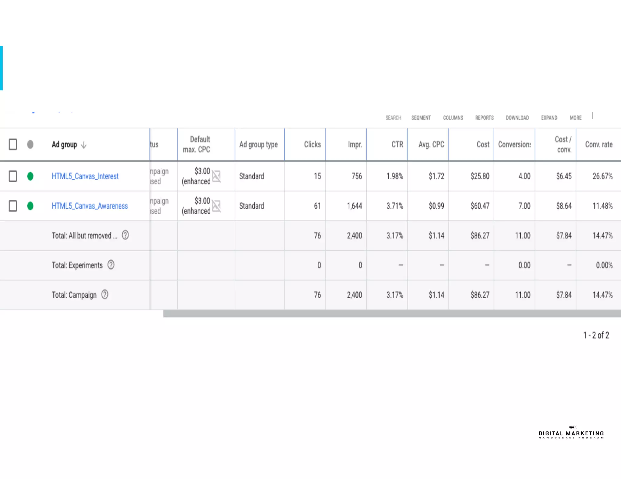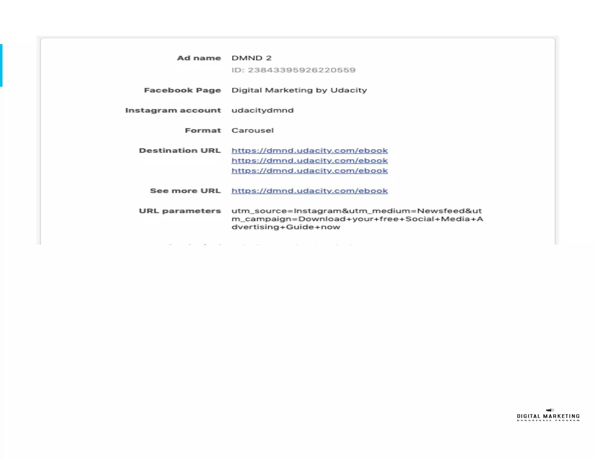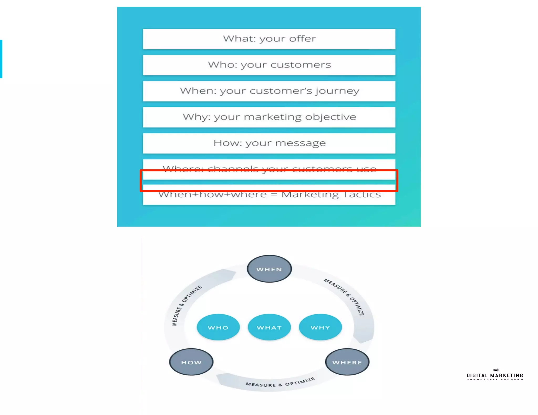 The document outlines a customer journey based marketing plan to sign up 200 new students for Udacity's Digital Marketing Nanodegree (DMND) program over one quarter with a $50,000 budget. It identifies the target persona as a 32-year old female professional seeking to upgrade her digital marketing skills. The plan details tactics for the awareness, interest, and desire phases of the customer journey across social media, search, display, and video channels. It allocates most of the budget to the desire phase and recommends additional tactics like search engine optimization and targeting LinkedIn. Key performance indicators include number of site visits, conversions, and achieving a positive return on investment.