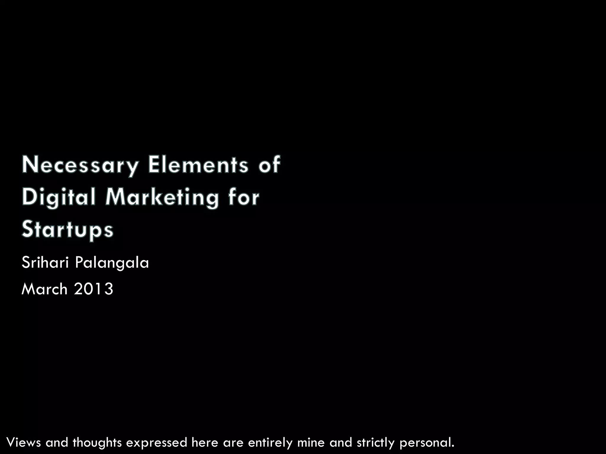 This document discusses using digital marketing tactics for a business. It begins by outlining some common challenges businesses face from a marketing perspective, such as tight resources and the need to target the right segments. It then focuses on using digital tactics like content marketing, social media, search engine optimization, and email marketing to address these challenges in a cost-effective way. Specific tactics are recommended for B2B and B2C businesses. Challenges with various tactics are also discussed along with suggestions to overcome them. The document emphasizes starting with online tactics before adding offline efforts.