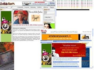 The document summarizes India's digital marketing strategy to promote tourism. It discusses launching a revamped tourism website in 2002 and conducting online advertising campaigns. The campaigns increased website traffic and led to initiatives like e-commerce integration and booking tools to make the site a one-stop-shop for travel planning. Further website upgrades and additional campaigns kept traffic growing through innovative advertising units and content.