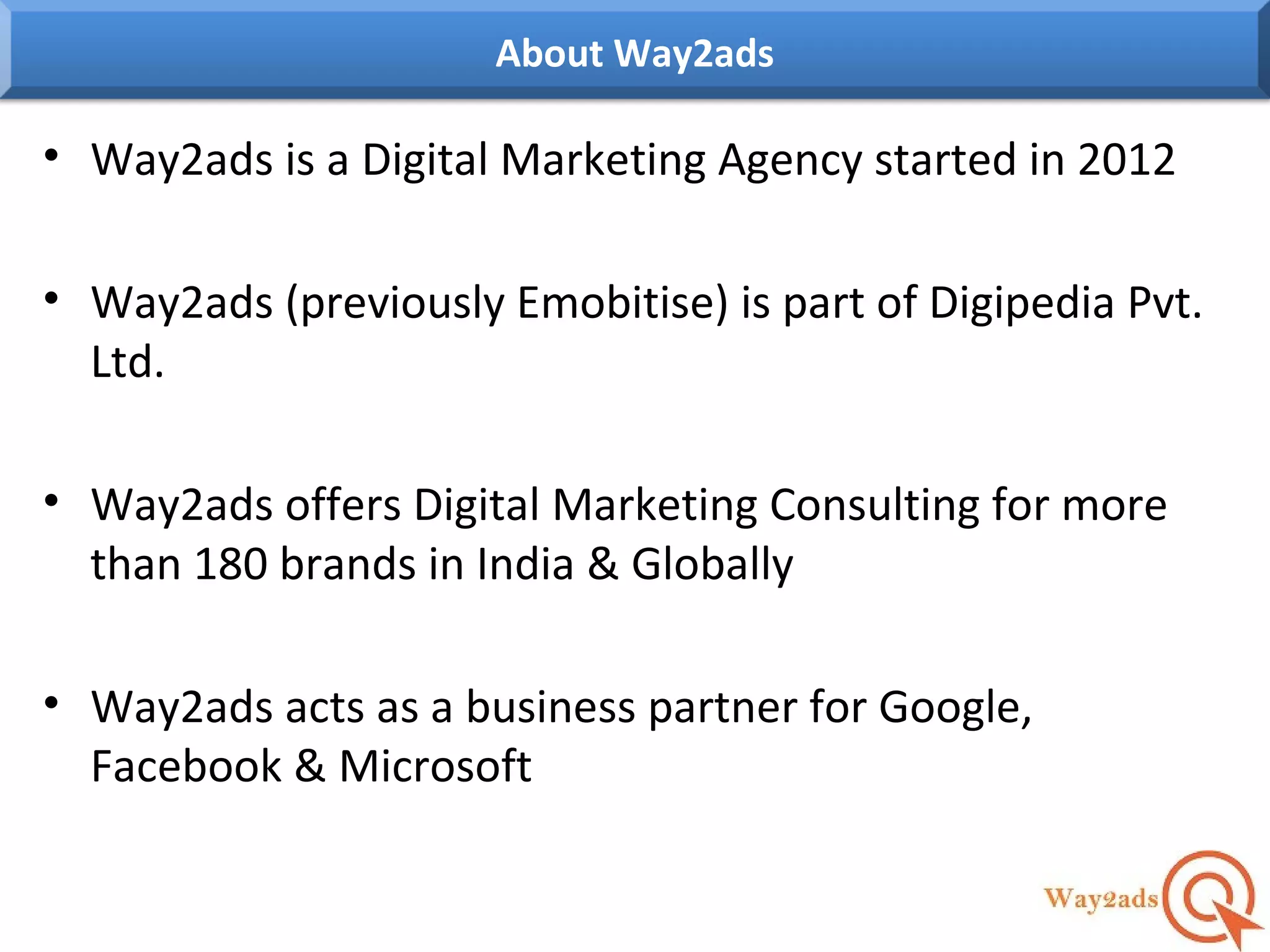 This document provides an overview of digital marketing agency Way2ads. It introduces Way2ads' services, team, and CEO. The agenda then outlines topics for a seminar on digital marketing, including definitions of digital and traditional marketing, the growth of digital marketing in India, key techniques, career opportunities, and certifications. Job roles in digital marketing and top companies to work for are also mentioned.