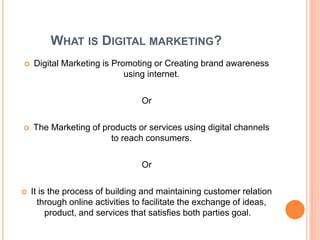 Digital marketing is promoting brands or creating awareness using online channels to engage with audiences and motivate them to take desired actions. It has objectives like reaching the right audience, engagement, motivating actions, efficient spending, and ROI. Digital marketing mediums include search engines, websites, social media, mobile apps, email, and inbound marketing. It is a more effective way to reach global audiences compared to traditional marketing and offers guaranteed ROI. Career opportunities in digital marketing include roles as a digital marketer, entrepreneur, professional job, freelancer, or online earnings.