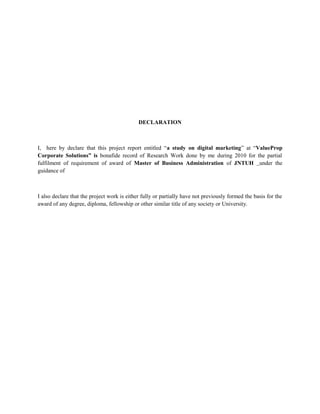 This document is a study on digital marketing conducted at ValueProp Corporate Solutions. It includes an introduction to digital marketing, objectives of the study, and scope. The document contains chapters on advantages of digital marketing, history and overview, business strategies, digital marketing tools and trends, internet marketing models and effects, web analytics methods, email marketing, search engine marketing and optimization, mobile advertising, and SMS marketing. It concludes with findings and suggestions. Methodology, data collection sources, and sampling areas are also discussed.