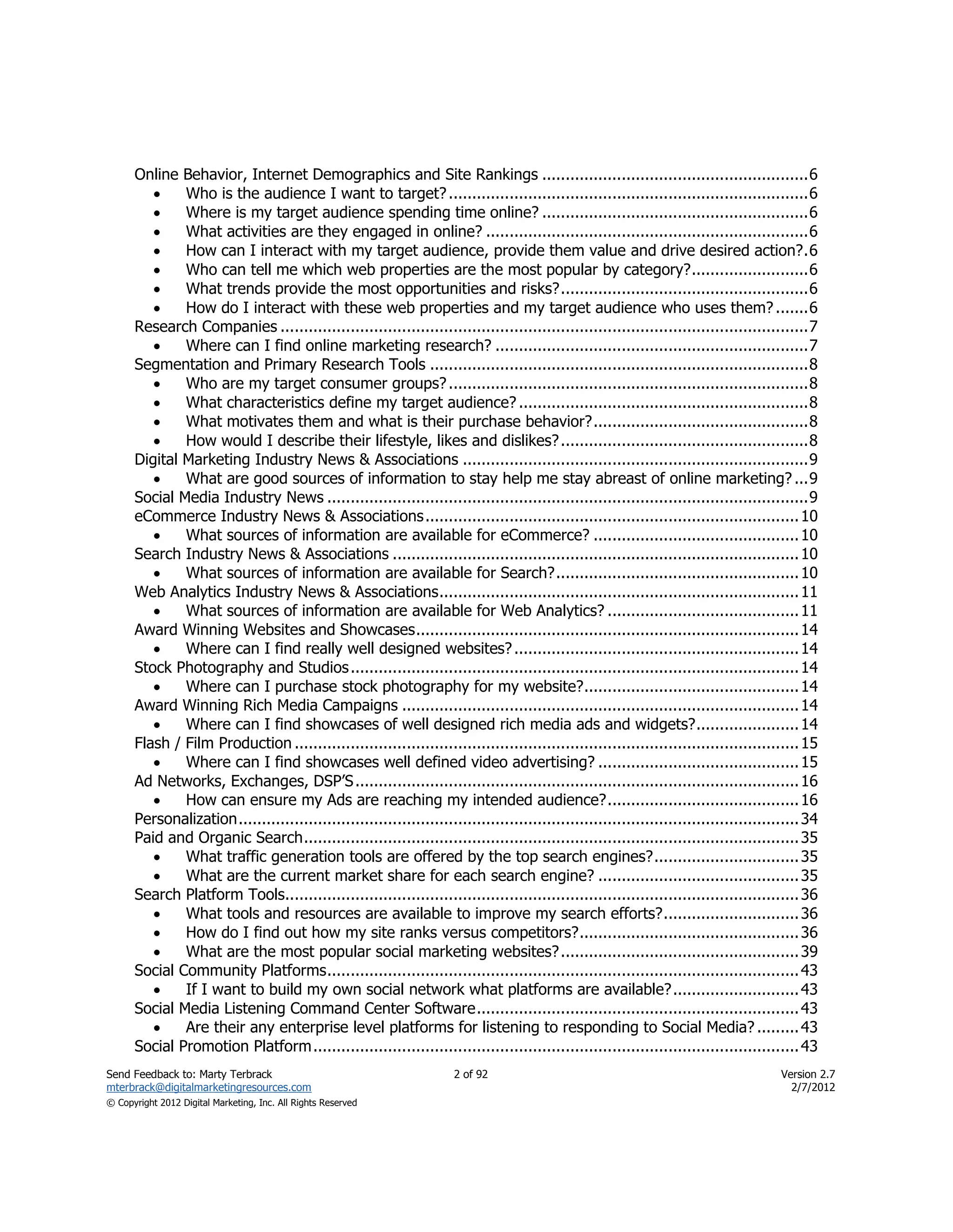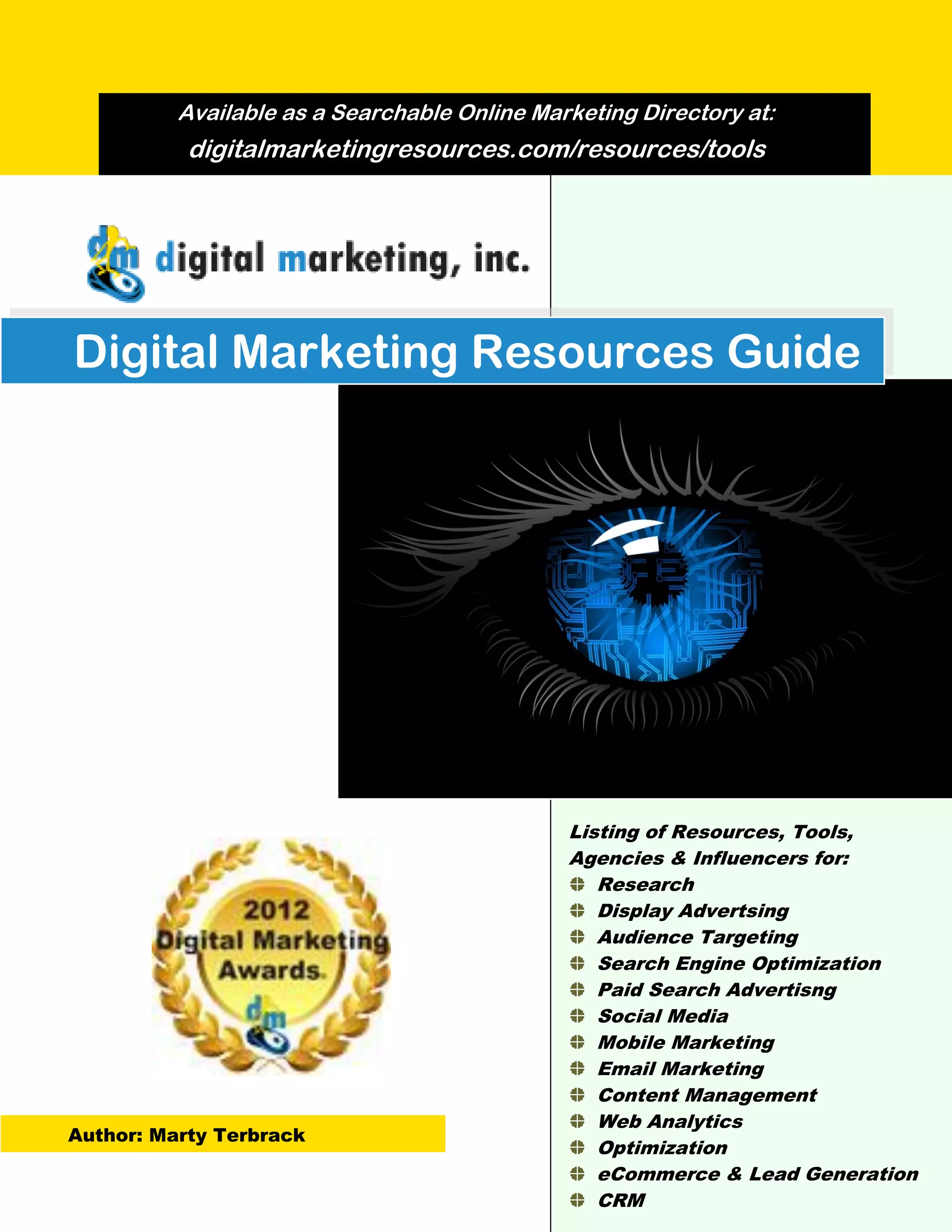 This document provides a listing of resources, tools, agencies, and influencers for digital marketing across various channels including research, display advertising, audience targeting, search engine optimization, paid search advertising, social media, mobile marketing, email marketing, content management, web analytics, eCommerce & lead generation, and CRM. It includes relevant companies, websites, and sources of information for each category to help answer common questions and needs for online marketing.