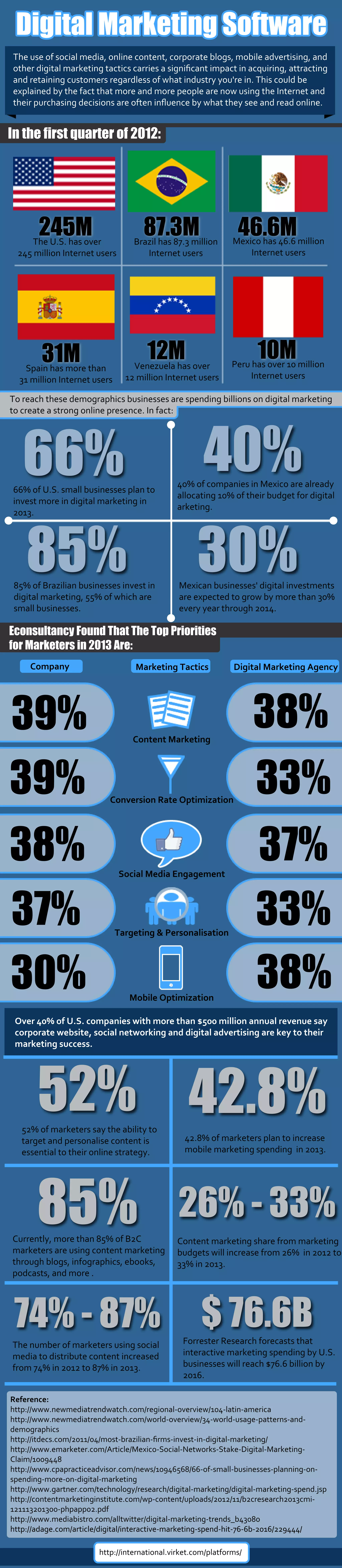 This document discusses trends in digital marketing across various regions and industries. It notes that the use of tactics like social media, online content, mobile advertising, and other digital strategies has a significant impact on acquiring, attracting and retaining customers, as more purchasing decisions are influenced by what people see online. Statistics provided show growing internet usage and digital marketing investments and priorities in countries like the US, Brazil, Mexico, and others.