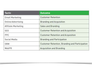 A digital marketing strategy involves building on traditional marketing strategies by using the benefits and challenges of the digital medium. It integrates online and offline tactics to achieve business goals and speak to an overall brand identity. The strategy considers factors like the market, competitors, customers and core competencies. It examines how the internet has changed traditional marketing models and determines the goals, tactics, metrics and ongoing optimization needed to create demand and exchange value with customers online.