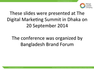 The document presents insights from a keynote speech by Michael Leander at the Digital Marketing Summit in Dhaka, Bangladesh, focusing on the essentials of successful digital marketing strategies. Key themes include understanding customer behavior, leveraging digital channels, creating engaging content, and adapting to changing market dynamics. It emphasizes the importance of personalization, measurable objectives, and the integration of humor and storytelling in marketing efforts.