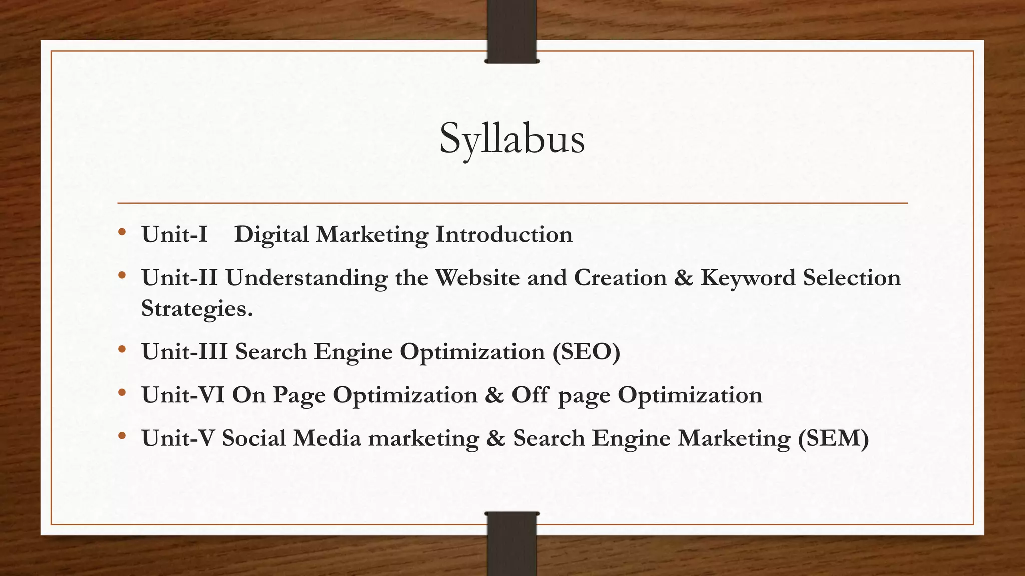 The document outlines a syllabus for a digital marketing course covering various units including digital marketing introduction, website creation, SEO, on-page and off-page optimization, and social media marketing. Key topics include types of digital marketing, website architecture, keyword strategies, and specific tactics for platforms like Facebook, YouTube, and Google AdWords. This comprehensive overview serves as a guide to understanding and implementing digital marketing techniques.