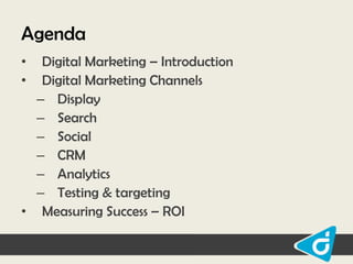 This document provides an overview of digital marketing. It begins with an introduction to digital marketing and its advantages over traditional marketing. It then discusses various digital marketing channels including display, search, social media, CRM, analytics, and testing and targeting. Finally, it covers measuring the success of digital marketing campaigns through ROI. The key aspects covered include the definition of digital marketing, its goals of awareness, engagement and conversion, and how it helps answer questions about taking products to market, search engine optimization, user feedback, and customer relationships.