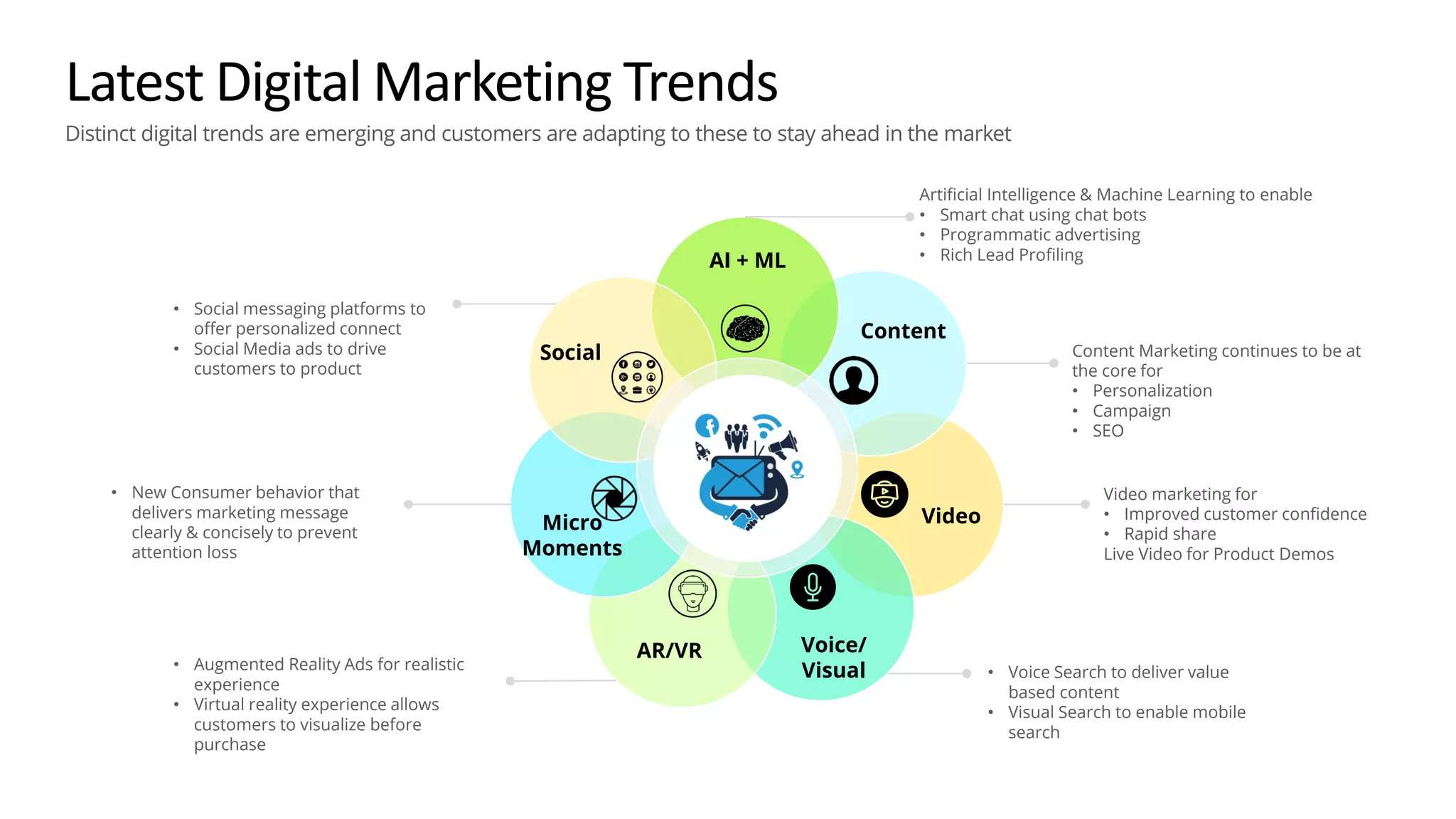 Artificial intelligence and machine learning can enable smart chatbots, programmatic advertising, and rich lead profiling to enhance digital marketing. Content, video, voice, visual, augmented reality, and virtual reality technologies along with social messaging platforms can be used to personalize campaigns, improve SEO, demonstrate products through live video, deliver value-based search results, enable mobile search, offer personalized connections, drive customers to products through social media ads, clearly and concisely deliver marketing messages to prevent attention loss, provide realistic experiences through augmented reality ads, and allow customers to visualize products before purchase through virtual reality. The latest digital marketing trends involve using these emerging technologies to adapt to changing customer behaviors and stay ahead in the market.