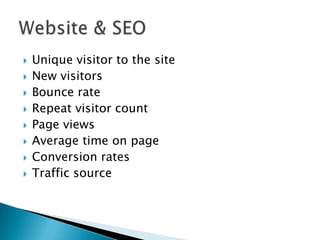 This document outlines various metrics used to analyze digital marketing performance, including metrics related to website traffic like unique visitors and page views, engagement on social media platforms like retweets and likes, links to the website, and metrics for evaluating the results of marketing efforts such as leads, ROI, and cost per click. It also includes metrics for measuring content creation activities.