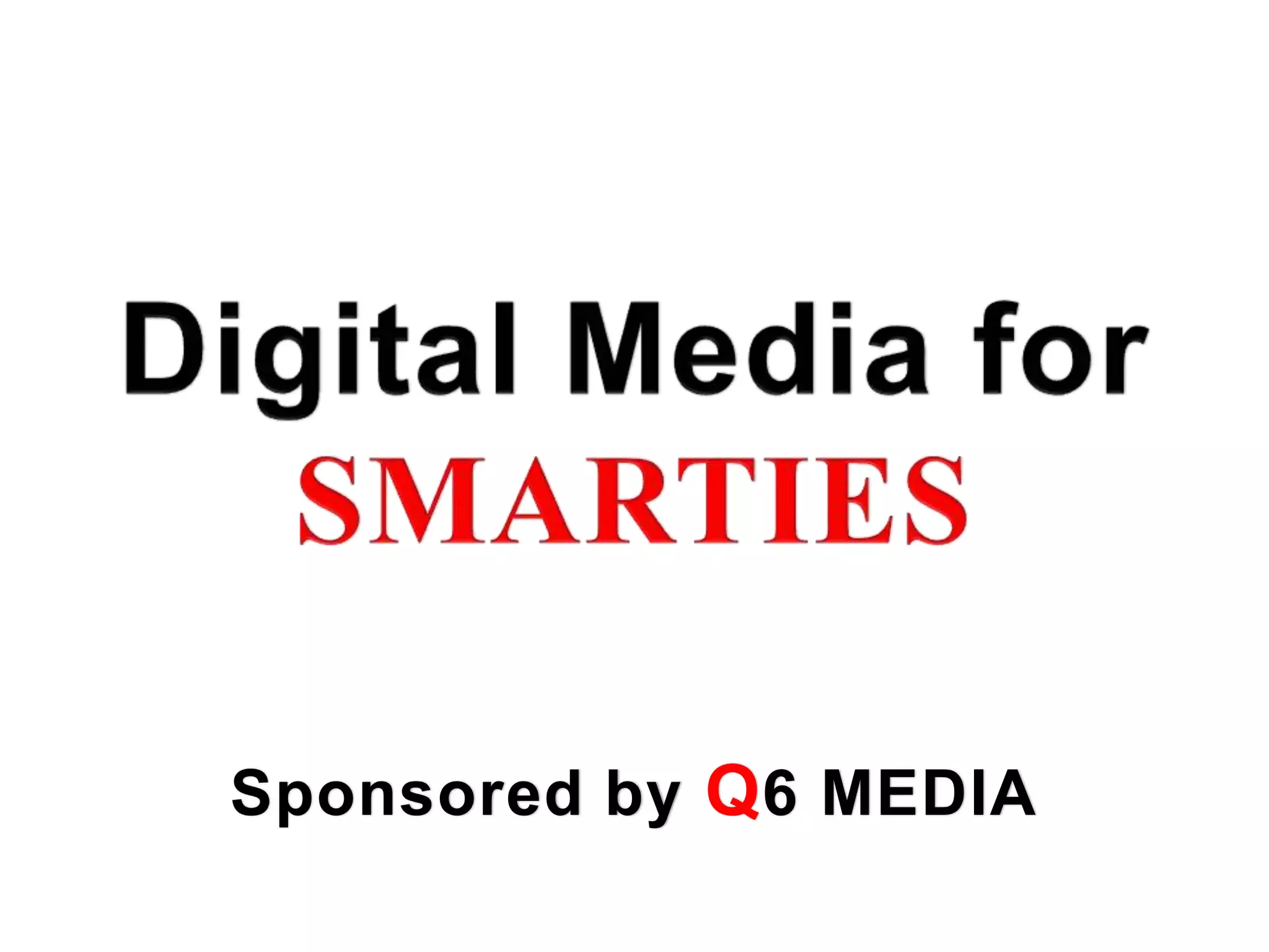 This document discusses digital media strategies for SMARTIES (Strategic Marketing and Reach to Increase Earnings) through Q6 Media. It promotes various digital media platforms like branded websites, videos, social media, email marketing, and broadcast media. These platforms can entertain, retain audiences, build connections, and personalize outreach. The document encourages businesses to use Q6 Media's digital media programs and tools to strategically market and increase their earnings. It provides contact information for representatives who can discuss these services.