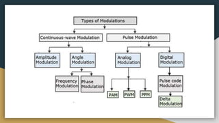 This document discusses different types of digital modulation techniques. It begins by defining modulation as the process of modifying characteristics of a high frequency carrier signal using a low frequency information signal. The key types of digital modulation covered are:
