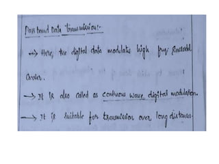 This document discusses digital modulation techniques. It introduces digital modulation as varying properties of a carrier signal using a modulating signal that contains information to be transmitted. The main types of digital modulation are amplitude-shift keying (ASK), frequency-shift keying (FSK), and phase-shift keying (PSK). Demodulation can be synchronous, where the transmitter and receiver clocks are synchronized, or asynchronous. ASK represents data as variations in the amplitude of a carrier wave, where a bit value of 1 transmits the carrier wave for the bit duration and 0 does not transmit the carrier.