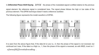 This document discusses various digital modulation techniques used in digital communications. It describes amplitude shift keying (ASK), frequency shift keying (FSK), phase shift keying (PSK) including binary PSK (BPSK) and quadrature PSK (QPSK). It provides block diagrams and explanations of modulators and demodulators for ASK, FSK, BPSK and QPSK. It also discusses M-ary encoding techniques that can transmit more than two bits simultaneously to reduce bandwidth.