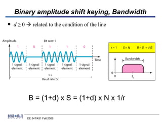 This document discusses various digital modulation techniques. It begins by explaining binary amplitude-shift keying (ASK), where one amplitude encodes a 0 and another encodes a 1. It then discusses on-off keying (OOK) and multiple amplitude shift keying (MASK). Next, it covers frequency-shift keying (FSK), phase-shift keying (PSK), differential PSK, and quadrature PSK. It also discusses more advanced modulations like quadrature amplitude modulation (QAM), continuous phase modulation (CPM), and Gaussian minimum-shift keying. The document provides examples and discusses the pros, cons, and applications of different modulation schemes. It concludes by discussing a student project involving designing and analyzing a digital