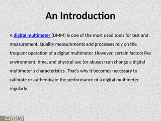 The document discusses the calibration process for a digital multimeter. It involves calibrating the direct voltage, alternating voltage, resistance, capacitance, and direct current functions of the multimeter using a multi-product calibrator. The calibration is usually done yearly but may vary depending on the environment and use of the multimeter. Important steps include calibrating each measurement function and recording identification, traceability, environmental conditions, and results with units.