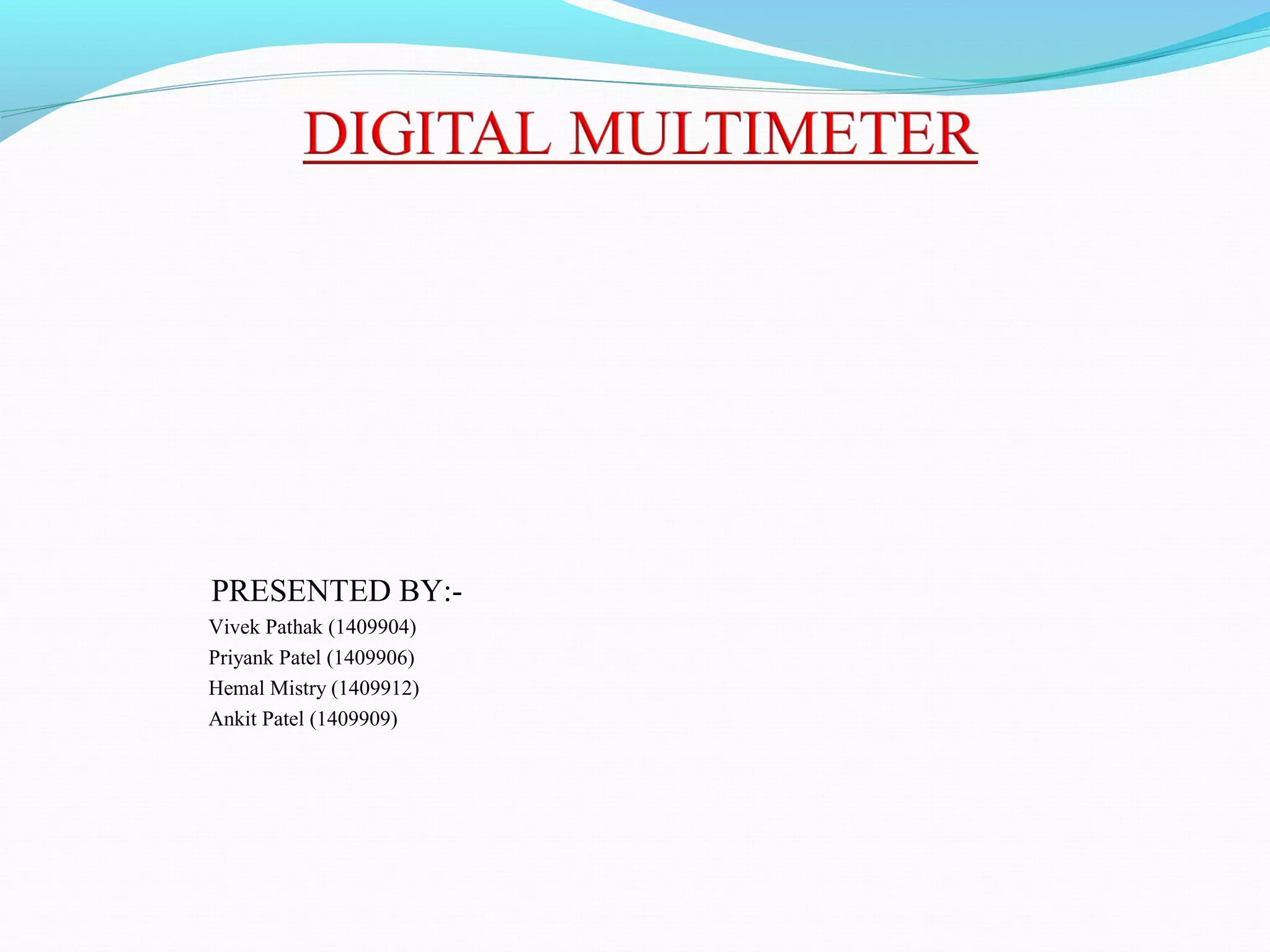 This document provides an overview of how to use a digital multimeter. It describes the basic components and functions of a multimeter. A digital multimeter contains three meters in one - a voltmeter to measure voltage, an ohmmeter to measure resistance, and an ammeter to measure current. It has a digital display and a function switch dial to select the meter's function. The function switch has settings for measuring DC and AC voltage, resistance, and current. The document explains how to set the function switch to the proper setting and range for measuring voltage, resistance, and current.