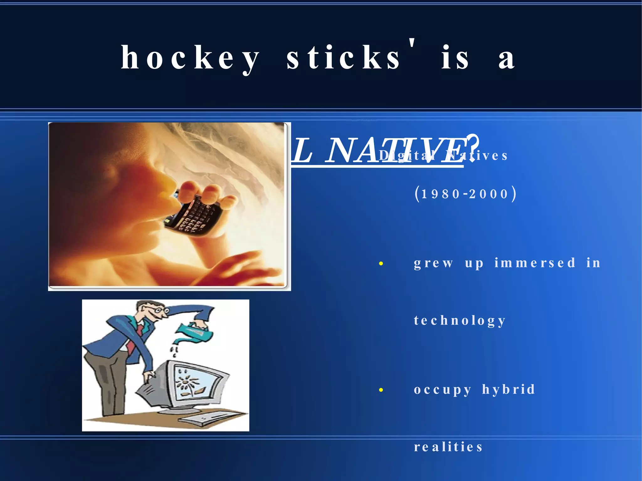 Digital Natives are people born between 1980-2000 who grew up immersed in technology and occupy hybrid realities. Digital Immigrants, born between 1946-1964, embrace technology to varying degrees. Other groups include Digital Aliens born 1925-1945 who are not interested in the internet, Digital Adaptives born 1965-1979 who were teens during video games and PCs, and Digital Avatars born 2000-present who have virtual relationships. Digital Natives prefer receiving multiple sources of information quickly through multitasking, visual learning, user generated content, and real-time fun learning, while Digital Immigrants prefer controlled, limited sources of information through single tasking, text/verbal before visual, and linear learning.
