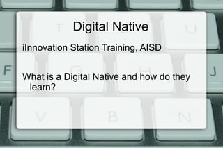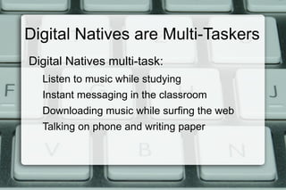 Digital natives are students who have grown up with technology and rely on it for studying, working, playing, relaxing and communicating. They are able to multitask with technology like listening to music while studying or downloading music while surfing the web. Digital natives learn from each other by conversing and sharing ideas, implementing what they have learned immediately. They view information as immediate and accessible through a very personal world that connects them beyond the classroom for both learning and entertainment.