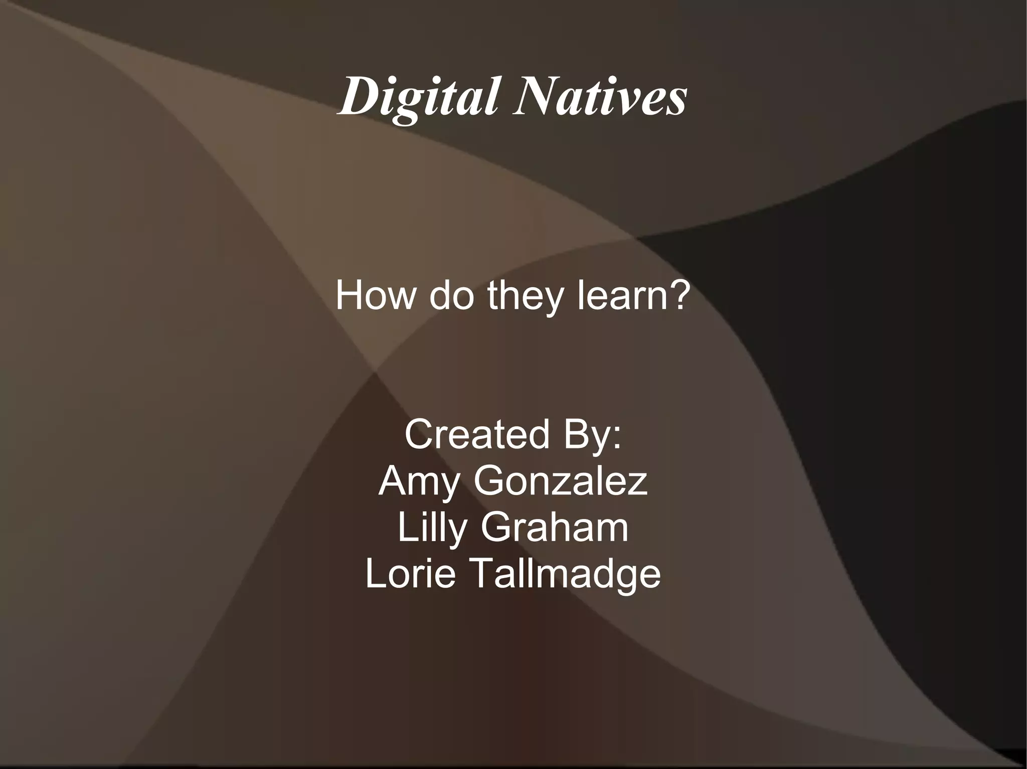 Digital natives are technology dependent learners who prefer kinesthetic and collaborative learning facilitated through audio/visual media rather than traditional teaching. They view teachers as facilitators and learn best through collaboration using various forms of multimedia rather than traditional lectures. They are social networkers who desire instant gratification and have regressed from older learning schemas.