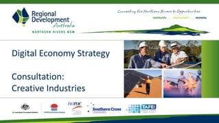 This document summarizes a consultation meeting about leveraging opportunities in the digital economy for the creative industries in Northern Rivers, Australia. The key topics discussed include: