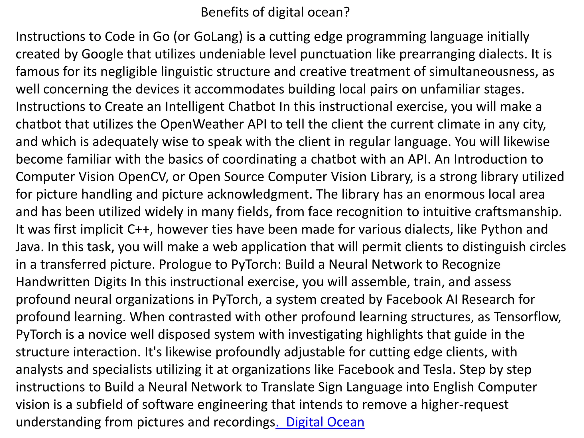 Digital Ocean provides cloud computing resources for developers and businesses. It offers virtual private servers that can be used to host websites, applications, databases and more. Servers are available in data centers around the world and can be provisioned quickly through their web interface or API. Pricing is transparent, with no hidden fees, and resources can be easily scaled up or down as needed. Digital Ocean aims to simplify cloud computing and provide an affordable option for developers and startups.
