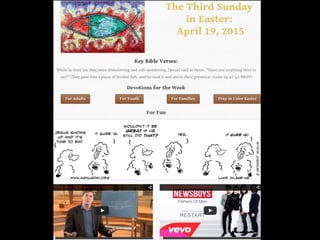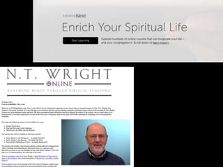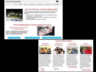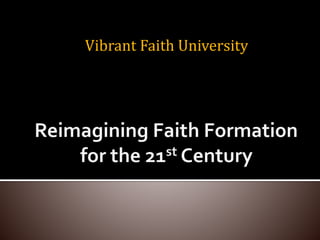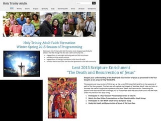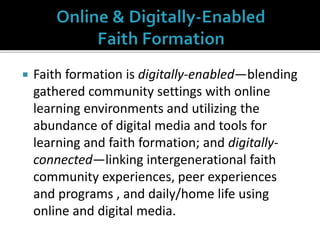 This document discusses how faith formation can be enhanced through digital and online resources. It describes a variety of models for integrating online and digital content into faith formation programs, from using online content to supplement gathered programs to offering fully online faith formation with opportunities for regular in-person interaction. Examples of online content that could be developed include daily devotions, Lenten and Advent materials, Bible studies, courses on theology and spirituality, and parenting resources. The goal is to make faith formation more accessible through digital tools and content.
