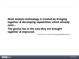 The document summarizes the BBC Research & Development's work in collaborating with academic and industry partners to develop new broadcasting technologies. Some key areas of focus include developing IP networks for content distribution, exploring new formats for non-linear viewing experiences, and creating spatially aware devices. The BBC aims to help shape the future of media through partnerships that bring together diverse expertise from different organizations.